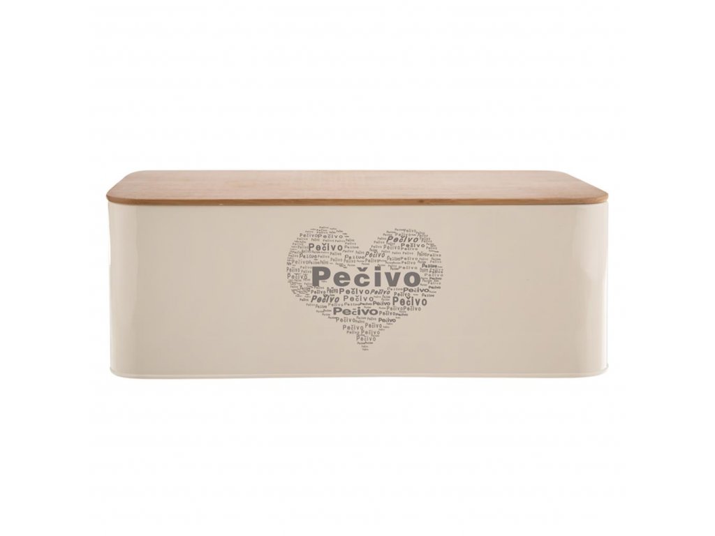Plechový chlebník hranatý s motívom PEČIVO na uloženie pečiva s dreveným viečkom na uzavretie a je použiteľné ako doska na krájanie alebo ako podložka pod horúci hrniec alebo misku.Dodatočné parametre