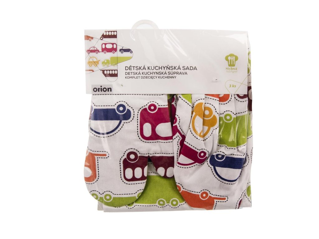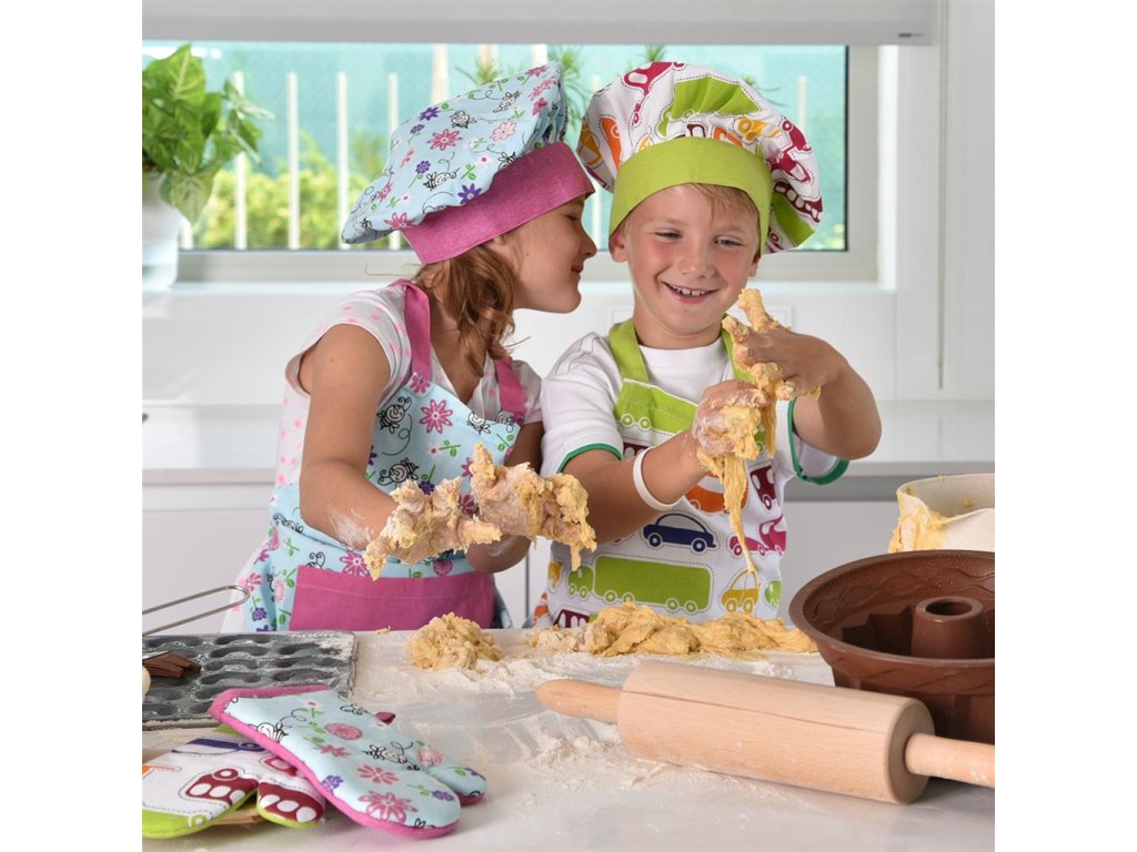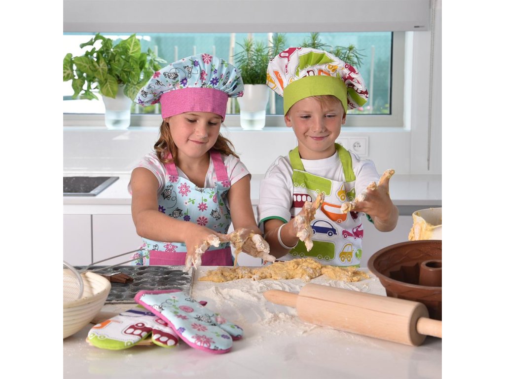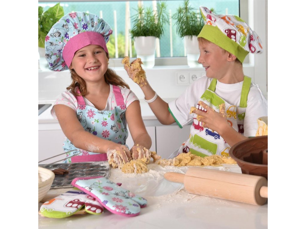 Nechajte aspoň občas v kuchyni kraľovať malých kuchárov a cukrárov. Určená je pre nich trojdielna súprava skladajúca sa zo zástery, čiapky a chňapky. Uchráni detské oblečenie pred zamúčením pri pečení. Vašim ratolestiam rozžiarite očká týmto praktickým darčekom. Rozmery: obvod čiapky 50-52 cm, zapínanie na suchý zips, dĺžka zástery 65 cm, zaväzovanie v páse aj za krkom, dĺžka rukavice 21 cm, s pútkom na zavesenie. Materiál: bavlna.Možno prať v práčke.Dodatočné parametre
