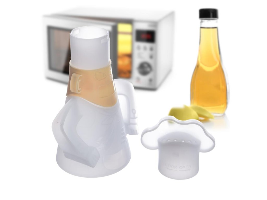 Vtipný plastový čistič v podobe nahnevaného kuchára, Vám pomôže jednoducho vyčistiť Vašu mikrovlnku behom chvíle. Stačí do neho naliať ocot s vodou v pomere 50:50 po vyznačenú odmerku, a zbaví Vás vďaka vzniknutej pare všetkých nečistôt a mastnoty. Následne stačí mikrovlnku utrieť suchou handričkou. Materiál: plast. Rozmery: 11,5x7x16 cm.Dodatočné parametre