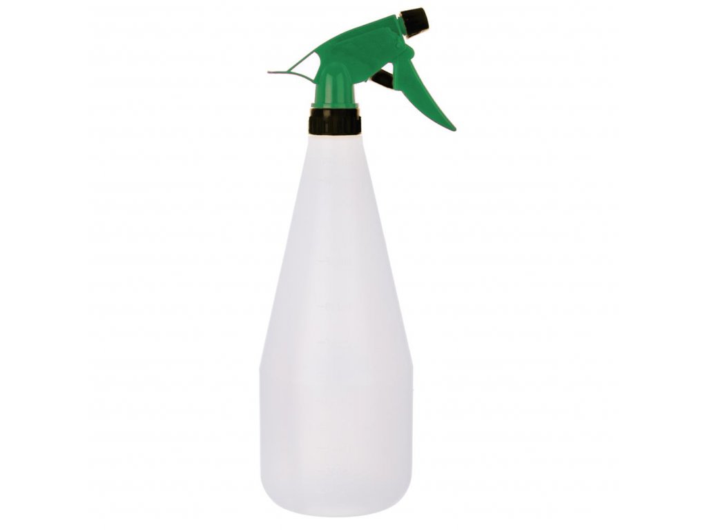 Plastový rozprašovač s odmerkou na fľaši po 100 ml. Objem rozprašovača je 1 l. Plastové zeleno-čierne viečko s rozprašovacím mechanizmom je na závit.