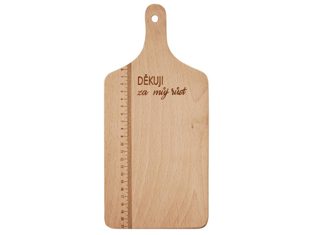 Rustikálna doska - lopárik na krájanie či servírovanie. S praktickou rukoväťou a s vypaľovaným dekorom DĚKUJI za můj růst. Pohodlne a štýlovo na nej naservírujete raňajky i večere. Využiteľná je pri kuchynských činnostiach ako krájanie, či príprava na grilovanie. Výnimočne jednoduchá údržba, stačí pretrieť vlhkou handričkou a doska je opäť pripravená na používanie. Materiál: drevo. Rozmery: 30x14 cm.