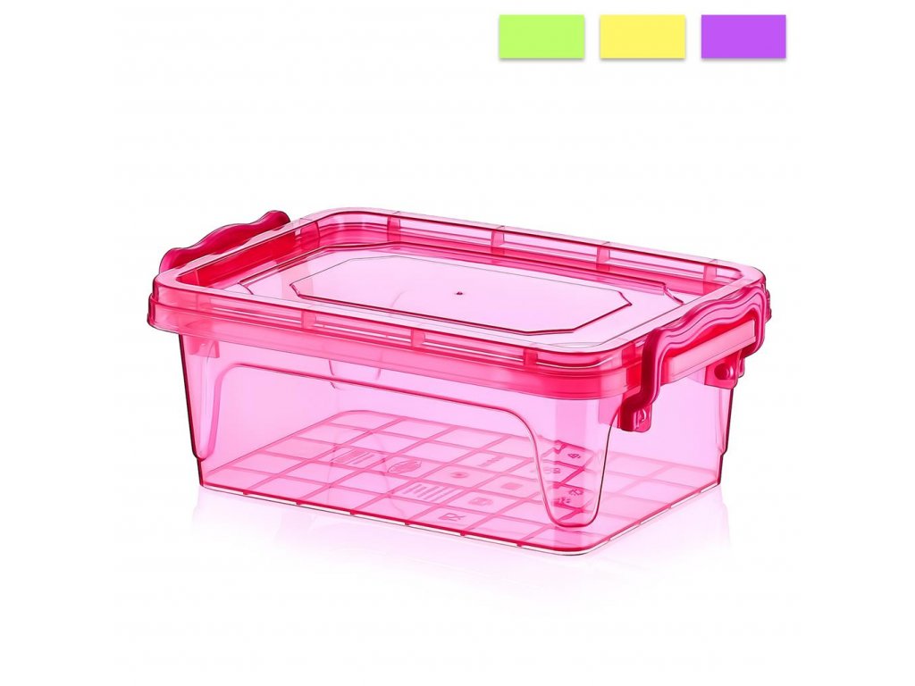 Priehľadný box obdĺžnikového tvaru v rôznom farebnom prevedení poslúži na uskladnenie drobností či už v kuchyni alebo i v detskej izbe. Transparentný materiál vám poskytne prehľad o obsahu boxu. S viečkom a dvoma klipsami. Praktickosť boxu zvyšuje jeho stohovateľnosť. Vhodný do chladničky, mikrovlnnej rúry aj do umývačky na riad. Materiál: plast. Rozmery: objem 0,6 l, Š 16,5 x H 11 x V 6 cm.Dodatočné parametre