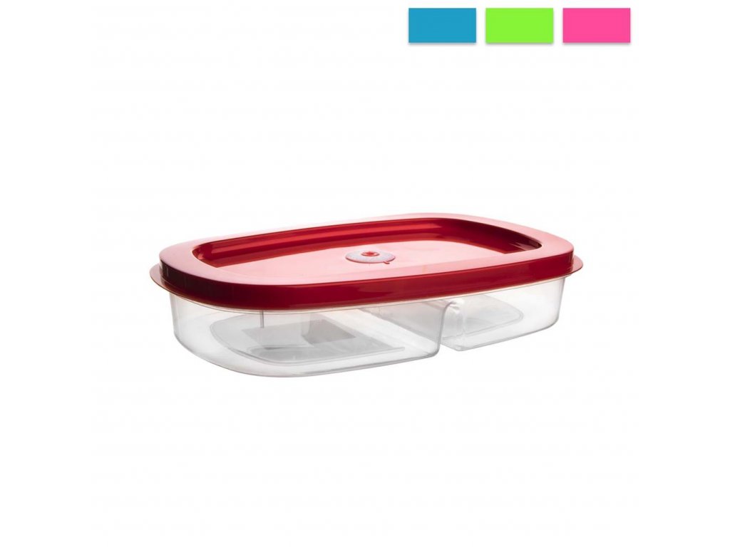 Dóza plastová, delená s vekom. Praktická na uskladnenie a prenášanie potravín. Nadčasový dizajn určite nájde uplatnenie v každej domácnosti. Je vhodná do chladničky, mikrovlnnej rúry ako aj do umývačky riadu. Rozmery: 26x17,5x5 cm, objem 1,4 l.Dodatočné parametre