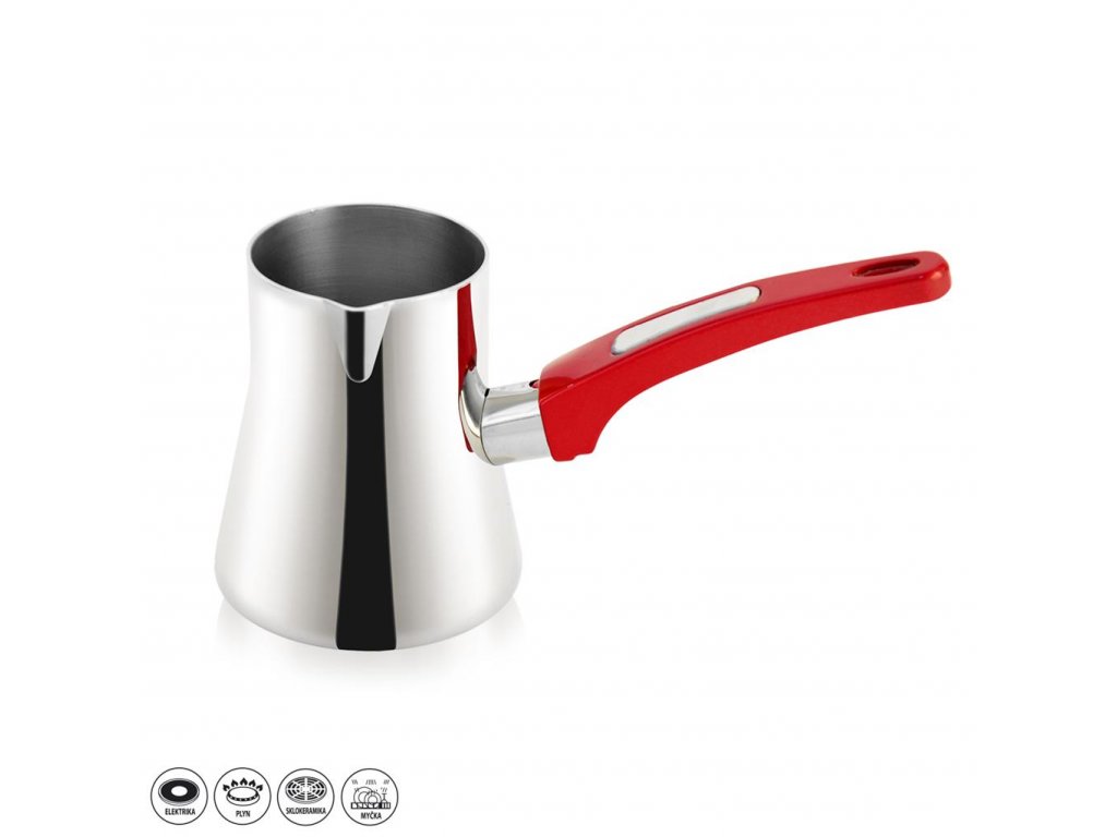 Džezva s plastovou rukoväťou je výborným pomocníkom na príravu kávy. V džezve káva neostáva stáť a neextrahujú sa v nej nežiadúce látky. Má rozšírený vrchný "golier", ktorý bráni vykypeniu. Výlevka Vám uľahčí pohodlnejšie nalievanie. Možnosť používania na plynom a elektrickom sporáku či sklokeramickej doske. Materiál: nerez, plast. Rozmery: priemer: 8 cm, výška 9,5 cm. Objem: 0,33l.Dodatočné parametre