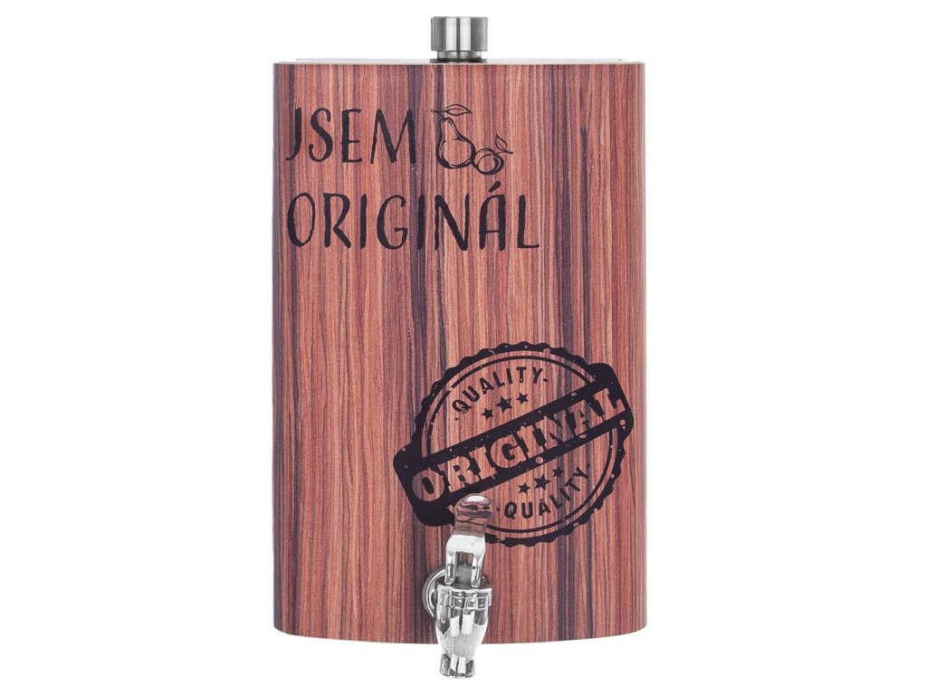 Nerezová vrecková MAXI fľaša na alkohol, ploskačka s dekorom JSEM ORIGINAL s nerezovým vrchnákom na závit aj s kohútikom. Vtipný darček pre mužov. Objem 1,7 l.