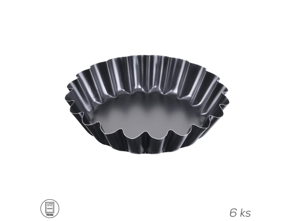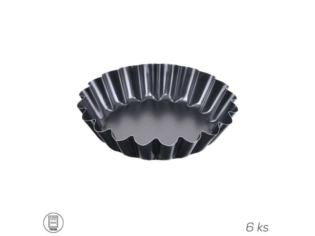 Koláčová forma s vlnitým okrajom na pečenie tartaletiek a iných sladkých i slaných pokrmov. Vďaka svojmu nepriľnavému povrchu zabránite prilepeniu cesta. Forma sa ľahko umýva pod tečúcou vodou. Sada obsahuje 6 ks formičiek. Max 200 °C. Rozmery: priemer 9 cm, výška 2 cm.Dodatočné parametre