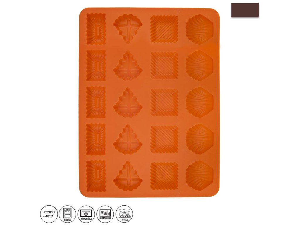 Silikónová forma, v ktorej vytvoríte naraz až 20 chutných sušienok. Vyrobená je z kvalitného silikónu, ktorý je nenáročný na údržbu - je možné ho použiť aj do umývačky riadu. Nepriľnavý povrch, uľahčí vyberanie hotových labiek z formy. Je imúnna voči teplotám od - 40°C do + 220°C. Vyrobená v dvoch farebných prevedeniach. Materiál: silikón. Rozmery: (dxšxv) 28,5x21x1,5 cm.