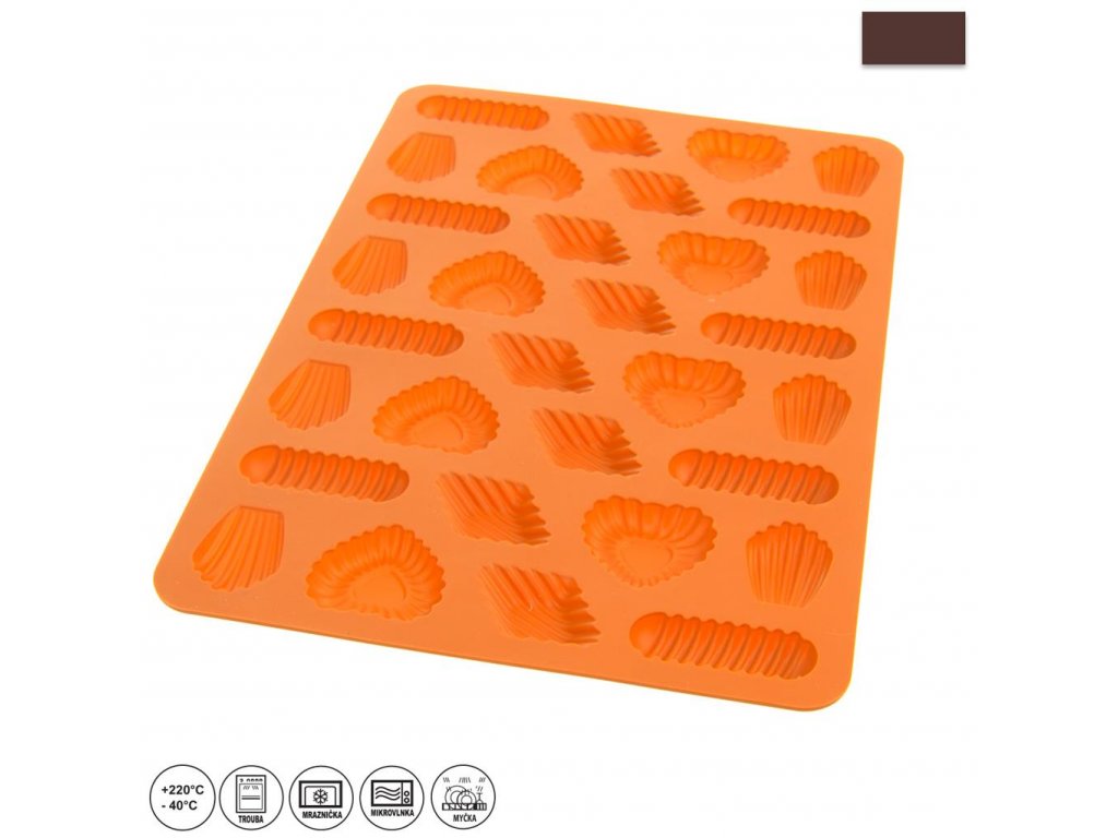Silikónová forma na pečenie, ktorými spravíte radosť najmä deťom. Naraz upečiete až 32 formičiek. Formu tiež môžete použiť na výrobu čokolády, piškót, gumených cukríkov, marcipánu ale aj na výrobu mydielok či ľadu. Je vyrobená z moderného materiálu s nepriľnavým povrchom, vďaka ktorému sa cesto nepripaľuje.Taktiež nepreberá pachy z iných potravín a je hygienická. Forma je imúnna voči teplotám od - 40°C do + 220°C. Je vhodná aj do umývačky riadu. Vyrobená v dvoch farebných prevedeniach. Materiál: silikón. Rozmery: (šxhxv): 31x21x1 cm.