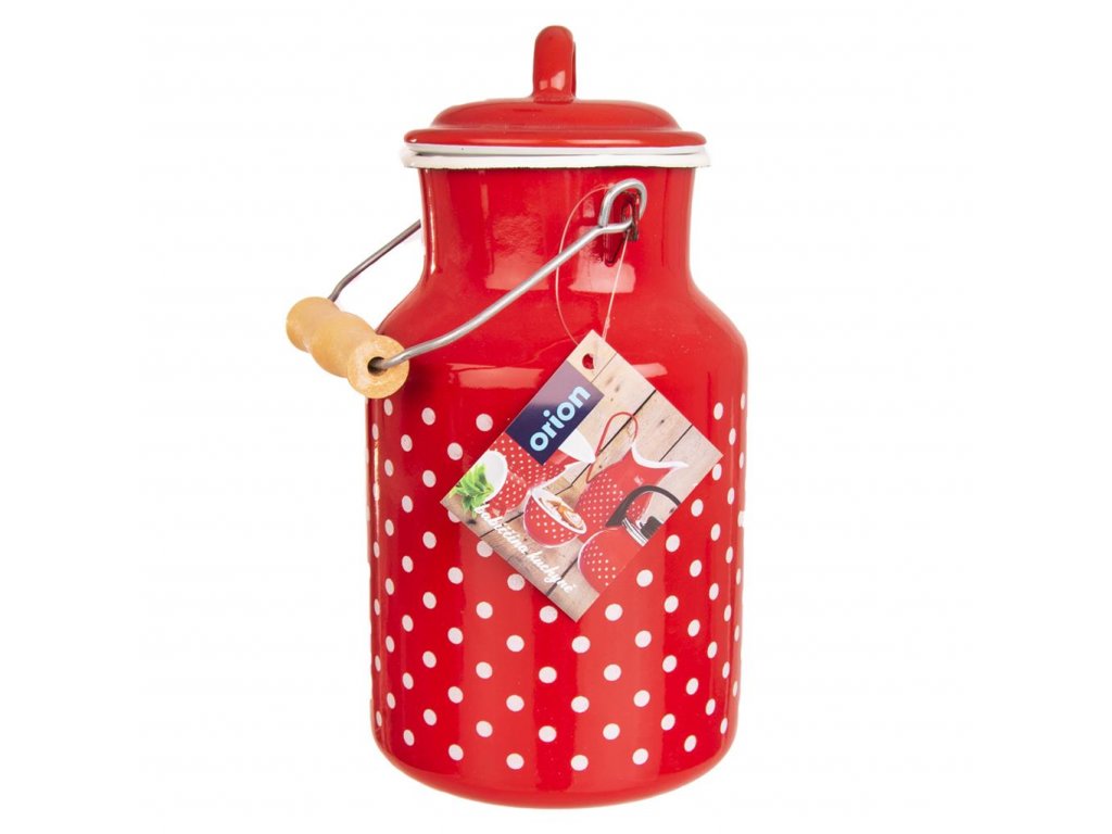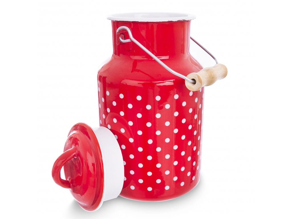 Červeno biela všestranne využiteľná kanvica s vrchnákom vám poslúži v domácnosti, na chalupe, chate či záhrade. Prinesiete si v nej čerstvé mlieko z mliekomatu, ale poslúži i na zber drobného bobuľovitého ovocia. Ako stvorená do ruky na výlet do lesa na zber čučoriedok. Vrchnák chráni obsah nádoby pred nečistotami a hmyzom, pred rozliatím či vysypaním. S praktickou drevenou rukoväťou na uchopenie. Roztomilý bodkovaný dizajn kanvice je čerešničkou na torte a robí ju vhodnou aj na originálny darček. Rozmer: objem 2 l, výška 26 cm.Dodatočné parametre