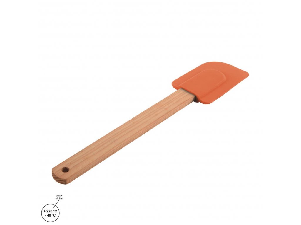 Mäkké zaoblené hrany tejto klasickej kuchynskej stierky dokonale priľnú k stenám nádoby. Poľahky pomocou nej bezo zvyšku vyprázdnite jej obsah - našľahaný bielkový sneh, krémy, nátierky či cestá. Jedna zo základných pomôcok každej gazdinky, cukrárky či pekárky. Materiál: silikón, odolný voči teplotám -40 °C až +220 °C, drevo. Rozmery: š. 5 cm, d. 26 cm.Dodatočné parametre