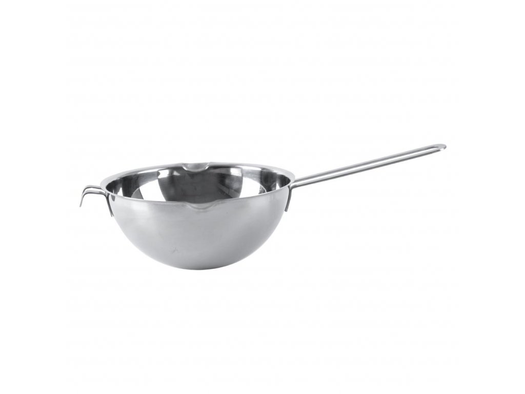 Na rozpustenie masla, čokolády či polevy vo vodnom kúpeli vám poslúži miska na vodný kúpeľ. Oceníte ju pri príprave plniek a krémov. Pre zjednodušenie vylievania je vybavená až dvomi výlevkami. Miska má rukoväť i uško pre pohodlné a bezpečné umiestnenie na hrniec. Materiál: kvalitný nerez. Rozmery: priemer vnútorný 11 cm, priemer vonkajší cca 14 cm. Dĺžka 26,5 cm, hĺbka 5 cm.Dodatočné parametre