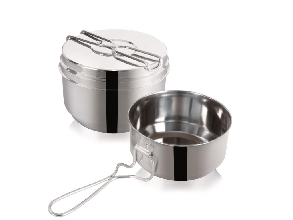 Praktická táborová súprava vhodná na kempovanie, táborenie alebo stanovanie. Pozostáva z veľkého a malého ešusu s uchom a pokrievky veľkého ešusu, ktorý sa dá použiť aj ako miska. Materiál: nerez. Vhodný na servírovanie, nie je vhodný na ohrievanie jedál! Rozmery: pr. 15 cm ,v. 9 cm, objem 1,5 l, pr. 13 cm, v. 7,5 cm, objem 0,9 l.Dodatočné parametre