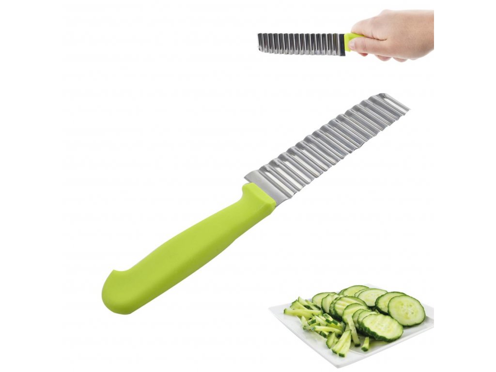 Nôž s vlnovitou čepeľou je vyrobená z kvalitnej nehrdzavejúcej ocele v kombinácii s plastom. Je vytvarovaný tak, aby sa s ním skvelo krájalo a manipulovalo, nakrájaná zelenina bude mať vlnovitý alebo mriežkovaný tvar. S ostrou čepeľou sa krája veľmi príjemne a presne. Skvelý pomocník do každej. kuchyne. Je vhodný do umývačky riadu. Materiál: oceľ, plast. Rozmery: celková dĺžka 23 cm, dľžka čepele 10 cm.Dodatočné parametre