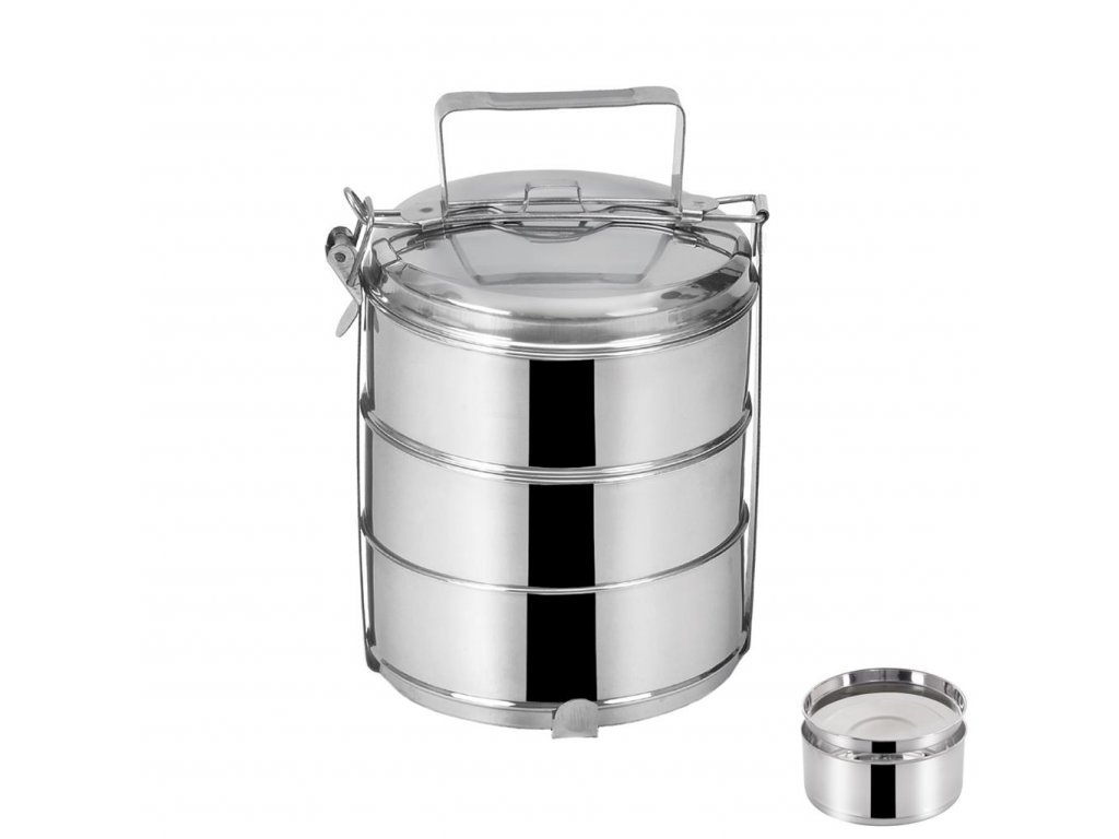 Celonerezový 3-dielny obedár na prenášanie potravín. Súčasťou balenia sú 2 ďalšie viečka a pokrievka. Obedár je vybavený kovovým stojanom s prackou na pevné uzavretie, čím nedôjde k samovoľnému otvoreniu. Rozmery: priemer misky 16 cm, výška 6,5 cm, celková výška 27 cm, objem 3x1,3l.Dodatočné parametre