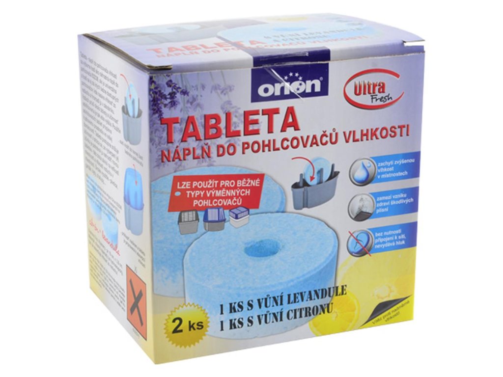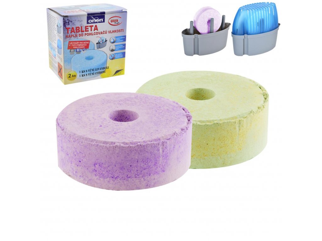 Náhradná TABLETA do odstraňovača vlhkosti. Tableta odsáva vlhkosť vlhkosť zo vzduchu. Zrazená voda sa zhromažďuje na dne plastovej nádoby pohlcovača. Tableta sa postupne stráca a účinok odstraňovania vlhkosti sa znižuje. Výmenou tablety sa znovu zabezpečí pôvodná účinnosť odvlhčovača. V balení 2 ks. Vôňa citrónu a levandule. Rozmery: priemer 10 cm, výška 3,8 cm, obsah 450 g.Dodatočné parametre
