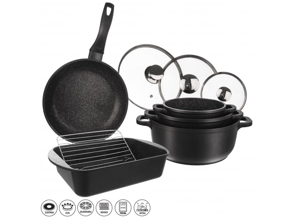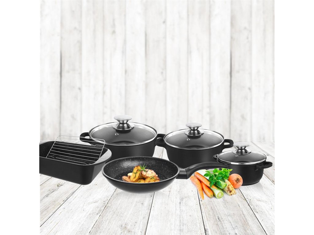 Sada riadu, 9 dielov – masívne hrnce s pokrievkou, panvica, pekáč a rošt s veľmi kvalitným nepriľnavým povrchom PFLUON GRANIT. Masívne hrnce GRANDE s pokrievkou, s ktorými bude vaše jedlo pripravené ešte chutnejšie a rýchlejšie ako ste zvyknutí. Vďaka veľmi kvalitnému nepriľnavému povrchu PFLUON GRANIT v nich môžete variť, smažiť, dusiť, opekať a zapekať s minimálnou potrebou tuku. Obsahujú pokrievku s otvorom pre únik prebytočnej pary. Vhodné na všetky typy spotrebičov vrátane indukcie aj rúry. Materiál: hliník s vynikajúcim nepriľnavým povrchom PFLUON GRANIT a s profilovaným dnom, sklo, nerez. Pri plynových sporákoch voľte správnu veľkosť plameňa, pri elektrických, sklokeramických a indukčných varičov je nutné zvoliť zodpovedajúcu veľkosť platničky. Pripravené jedlo môžete pohodlne skladovať v hrncoch tiež v chladničke. Pri použití v rúre s pokrievkou max. do 200 °C. Rozmery: hrniec pr. 16 cm, v. 8/13 cm, o. 1,4 l, hrniec pr. 20 cm, v. 8,5/13,5 cm, o. 2,4 l, hrniec pr. 24 cm, v. 10,5/16 cm, o. 4,2 l, panvica pr. 24 cm, v. 5 cm, pekáč 35x22x8 cm, rošt 24x16,5 cm.Dodatočné parametre