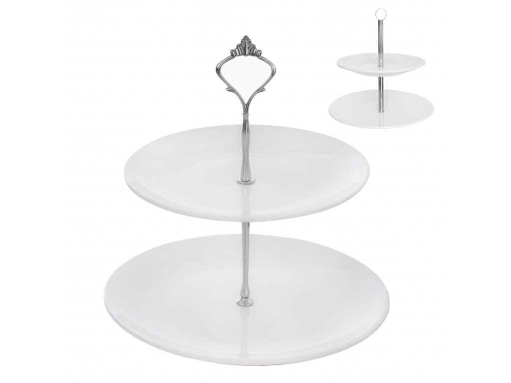 Dvojposchodový okrúhly stojan na servírovanie jednohubiek, chlebíčkov a zákuskov. Biely porcelán dodáva stojanu pekný vzhľad a hladký povrch. Stojan je taktiež vybavený držadlom pre pohodlné prenášanie. Vhodný aj do umývačky na riad. Materiál: porcelán. Rozmery: priemer 20,5 a 25,5 cm, výška 25 cm.Dodatočné parametre