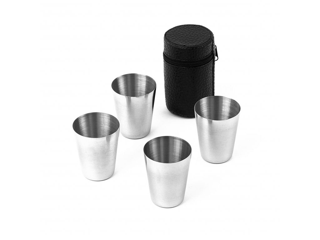 Nerezové poldecáky v púzdre na zips - Sada 4ks nerezových pohárikov v praktickom puzdre, ktoré je na zips. Vhodné na každú príležitosť alebo aj ako darček. Výborné na cesty, výlety, na ryby, na dovolenku... Súprava obsahuje 4 poháre a púzdro. Na rozdiel od sklenených sa nerozbijú a v púzdre sú veľmi skladné. Materiál: nerez, koženka. Rozmery: objem 0,03 l, priemer. 3,5 cm, v. 4 cm.Dodatočné parametre