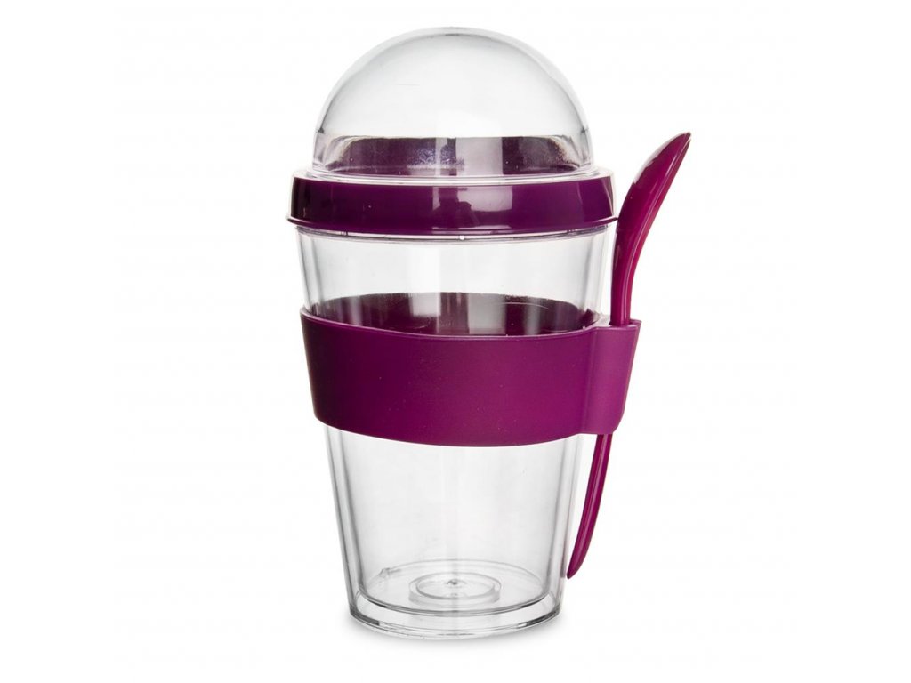 Pripravte si jogurt či desiatu do pohára s viečkom. Pohár má aj zásobník na müsli, lupienky alebo piškóty. Je vhodný aj na zeleninové a ovocné šaláty, studené polievky. Materiál: plast. Rozmery: objem 0,33 l, zásobník na chrumky 0,11 l, priemer. 9 cm.Dodatočné parametre