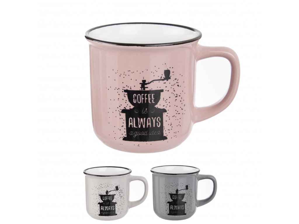 Hrnček keramický s uchom a dekorom GOOD IDEA. Vždy poruke, pripravený na rôzne druhy nápojov. Praktický dizajn a ušľachtilý materiál Vám zabezpečí pôžitok z nápoja či už pri práci, alebo oddychu. Je vhodný do mikrovlnnej rúry ako aj do umývačky riadu. Rozmery: priemer 9 cm, výška 8,5 cm, objem 0,37 l.Dodatočné parametre