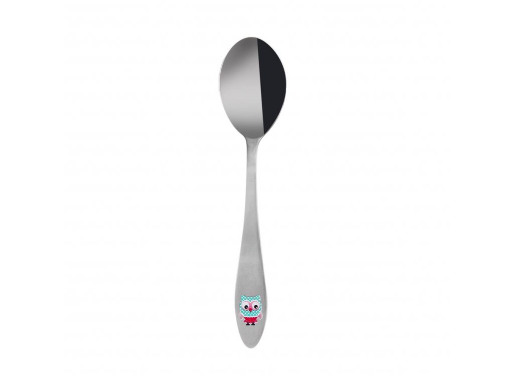 Detská lyžica s farebným dekorom sovy. Tvar prispôsobený deťom. Ideálne pre prvé samostatné návyky stolovania. Umývanie v umývačke na riad sa neodporúča, aby nedošlo k porušeniu farebného dekóru, čo nemôže byť dôvodom na neskoršiu reklamáciu. Materiál: kvalitný nerez. Rozmery: 15,5x3,5 cm.Dodatočné parametre