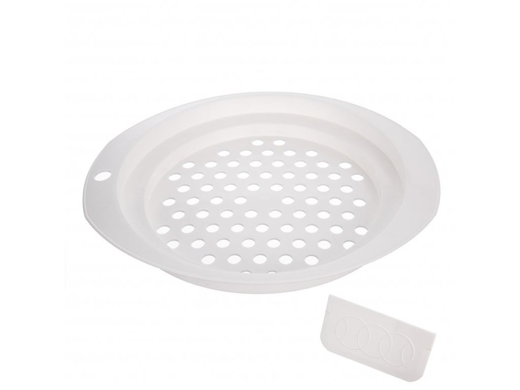 Plastové sito na výrobu halušiek do polievok a paprikášov všetkého druhu. Sito vďaka ušiam umiestnime na hrniec a bezpečne varechou pretláčame cesto do vriacej vody alebo polievky. Bezpečné upevnenie na hrniec od pr. 21,5 cm do 26 cm. Rozmery: šírka 31 cm, výšla 3,5 cm, priemer otvorov 0,5 cm.Dodatočné parametre