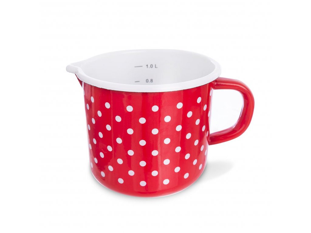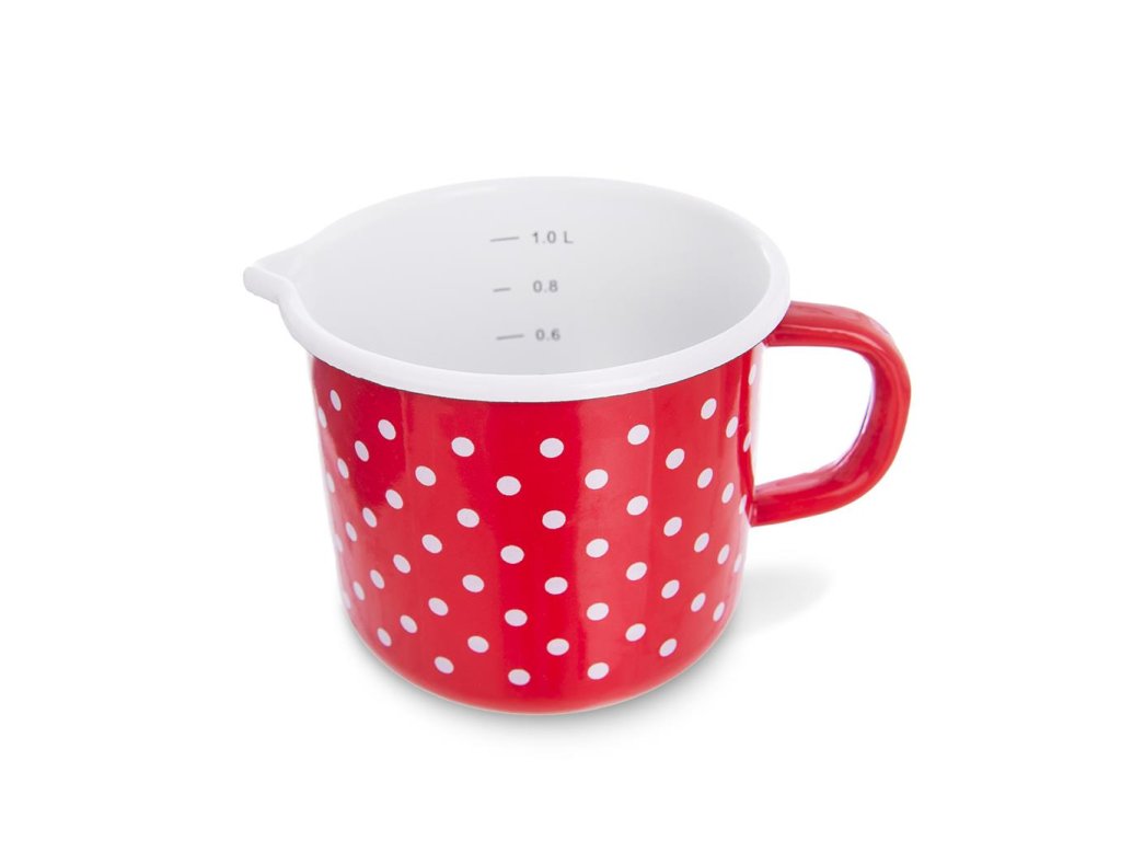 Veľký smaltový hrnček s farebným dizajnom s bodkami ozvláštni vašu domácnosť. Hrnček smaltový rovný s výlevkou je vhodný na všetky typy spotrebičov. Vhodný do umývačky riadu. Rozmery: priemer 12 cm, výška 11 cm, objem 1,2 l.Dodatočné parametre