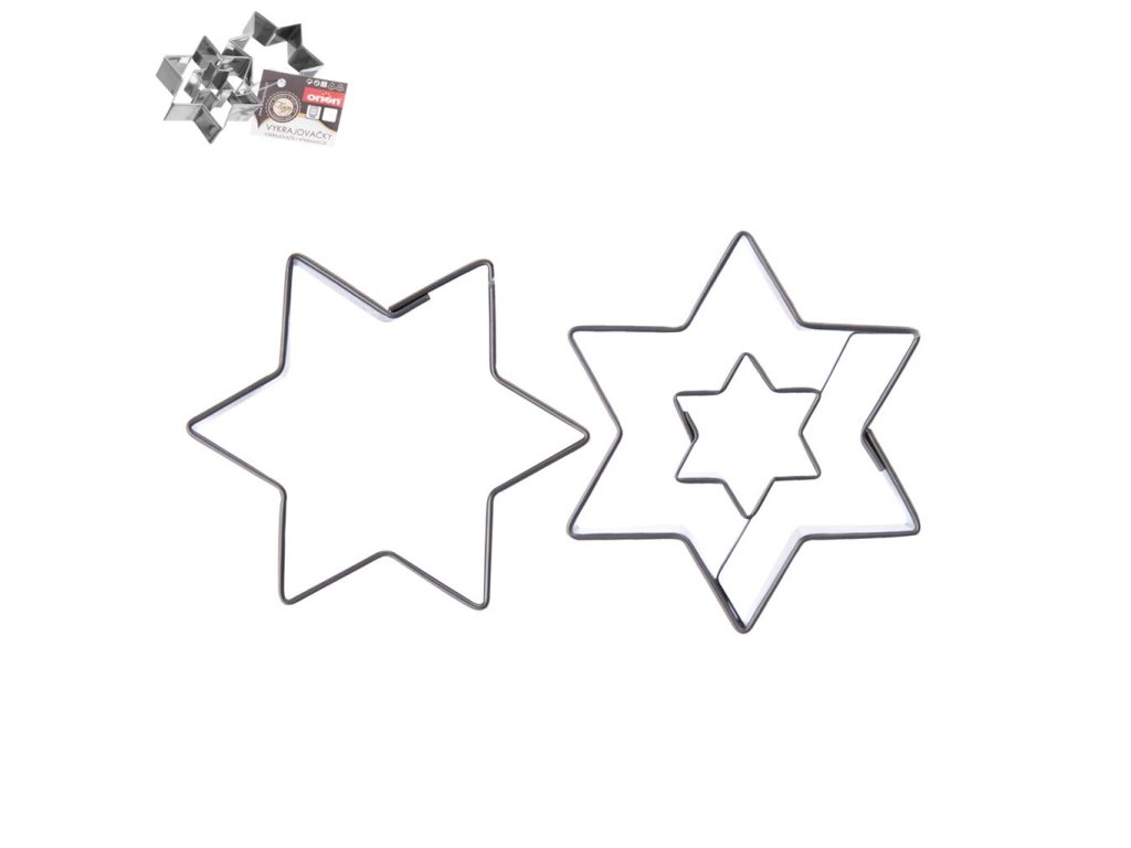 Nerezové vykrajovačky v tvare hviezdy, vhodné na vykrajovanie sladkých medovníkov. V balení je vykrajovacia formička bez stredu a so stredom. Materiál: nerez. Rozmery: 4,5x6,3 cm.