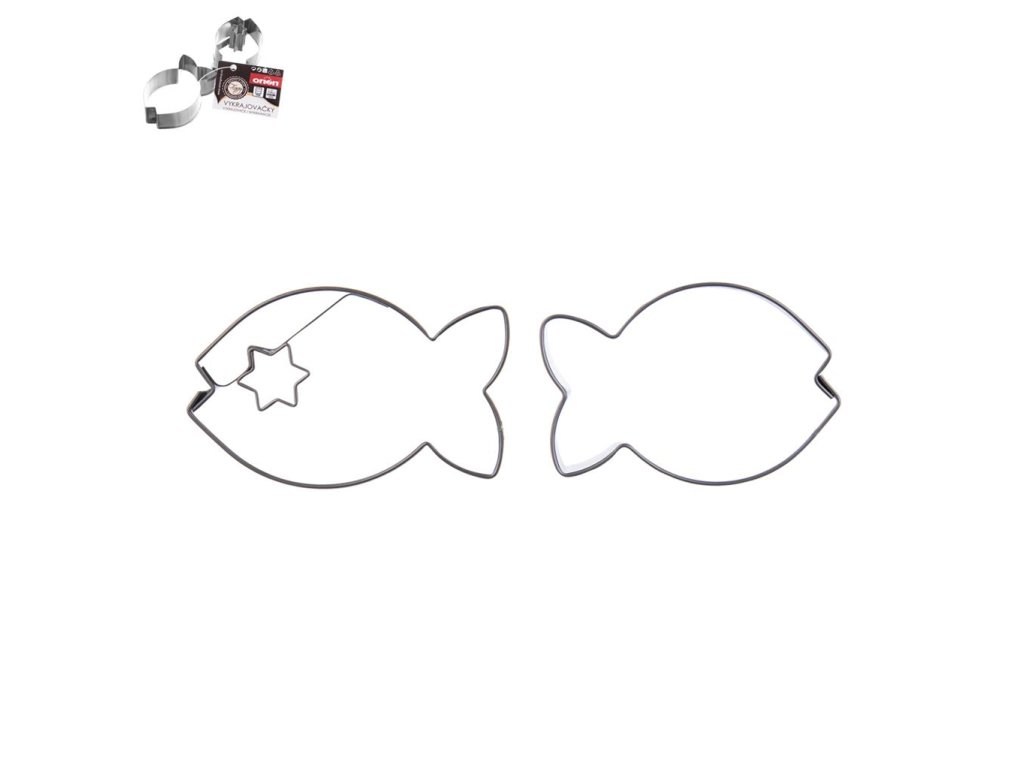 Nerezové vykrajovačky v tvare ryby, vhodné na vykrajovanie sladkých medovníkov. V balení je vykrajovacia formička bez stredu a so stredom. Materiál: nerez. Rozmery: 4,7x3,1 cm.