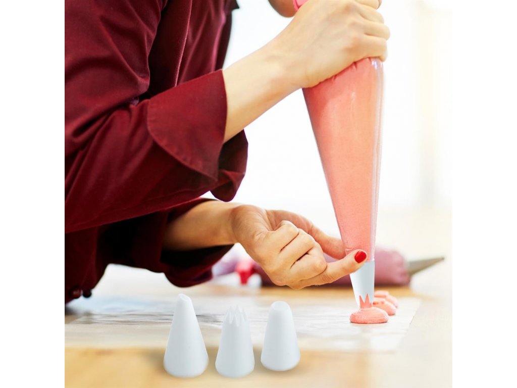 12 dielna sada sa skladá z 4 špičiek a 8 vreciek. Hrot vrecka odstrihnite a vložte zdobiacu špičku, ktorú si zvolíte. Vrecko naplňte krémom alebo nátierkou - podľa toho, či zdobíte sladké torty, zákusky, muffiny, cukrovinky alebo napríklad slané studené misy. Vrecká možno využiť po odstrihnutí hrotu i bez vloženia ozdobnej špičky. Materiál: plast. Rozmery: dĺžka vrecka 35 cm.Dodatočné parametre