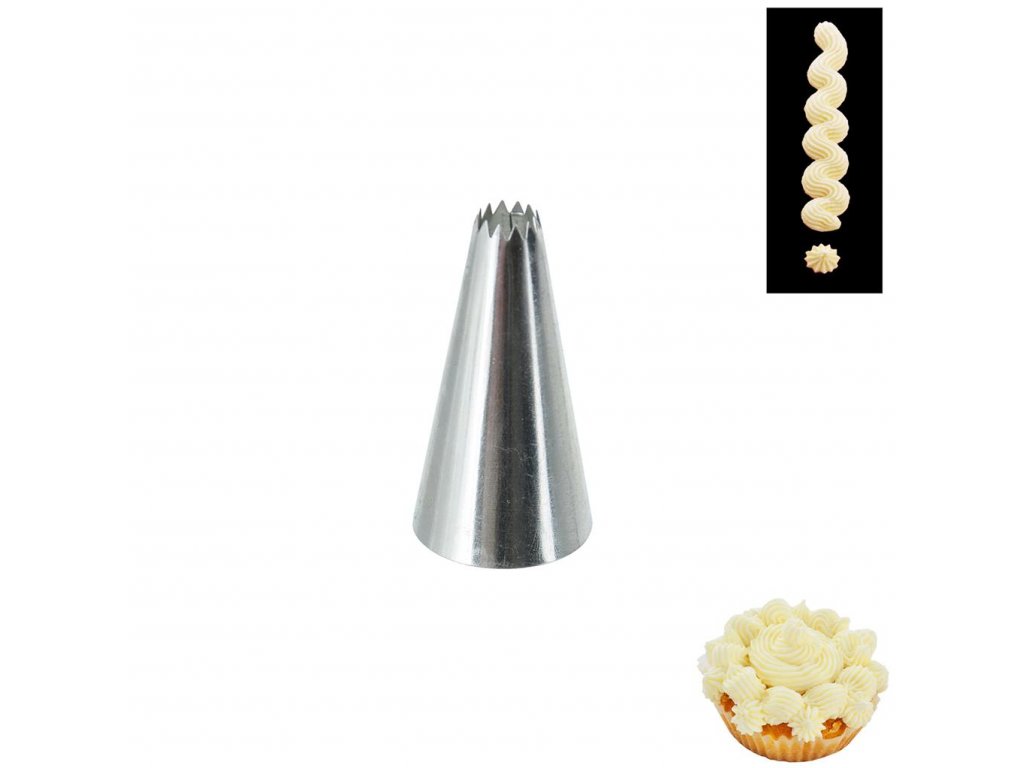 S touto členitou špičkou na zdobenie, ktorá má až 12 zúbkovitých výrezov, vám na cukrárskych výrobkoch vyčarí krásne 12 cípe hviezdičky alebo bohato ryhované vlnovky. Či ste cukrársky majster alebo začiatočník, jej použitím dosiahnete veľký efekt s malou námahou. Tip: možno použiť i na zdobenie populárnych slaných tort a chlebíčkov. Materiál: nerez. Rozmery: pr. 0,8 cm, dĺžka 5 cm.Dodatočné parametre